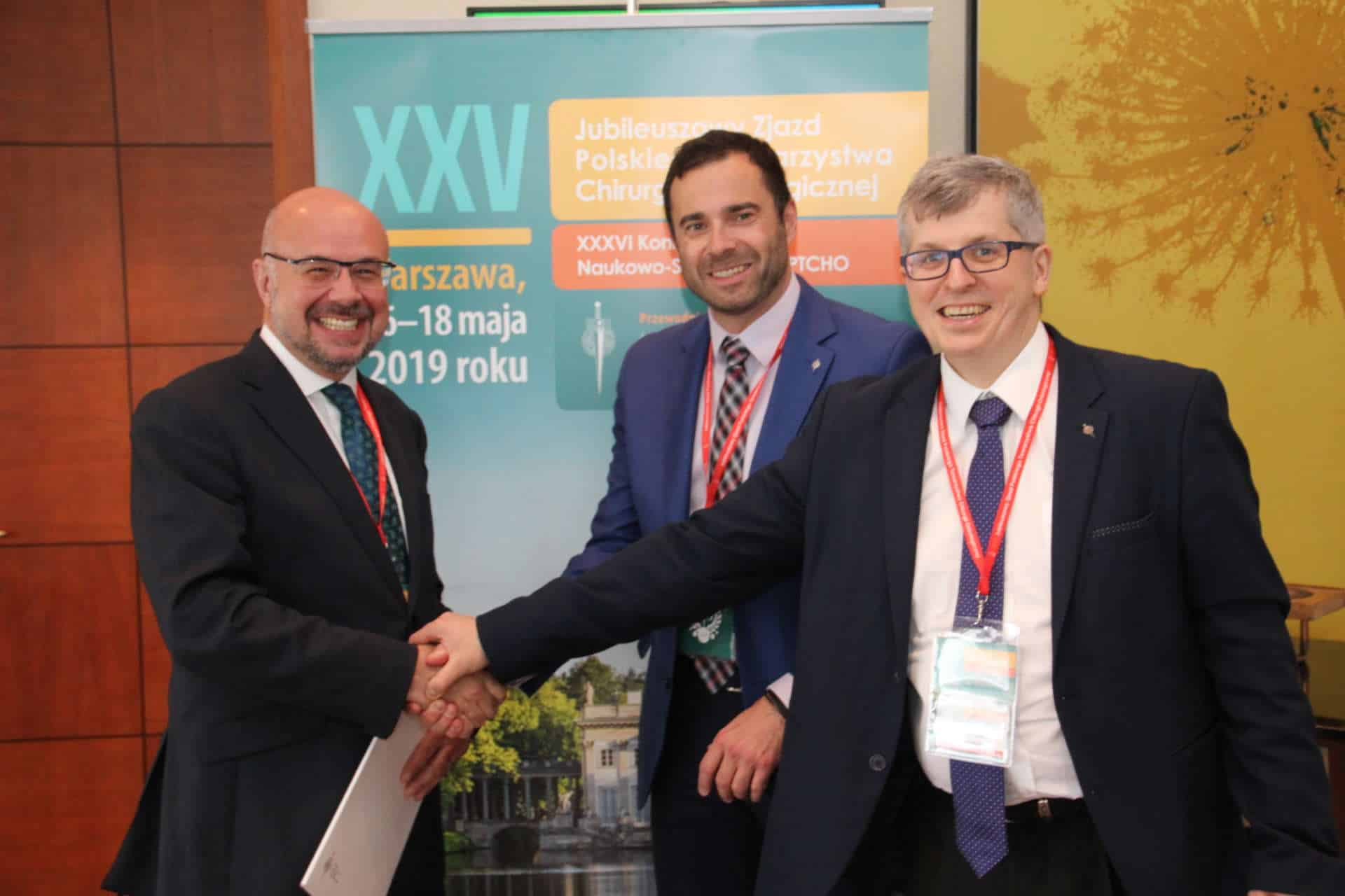 W dniu 17.05.2019r. podczas jublieuszowego XXV Zjazdu PTChO w Warszawie, Prezes ESSO, prof. Tibor Kovacs oraz prezes PTChO, prof. Wojciech Wysocki i sekretarz PTChO, prof. Piotr Rutkowski, podpisali memorandum of understanding pomiędzy europejskim i polskim towarzystwem chirurgii onkologicznej. Umowa ta umożliwia dalszy rozwój dobrej dotychczasowej współpracy i zwiększenie zakresu korzyści dla polskich członków PTChO, którzy zechcą zadeklarować wspólne członkostwo w obu organizacjach. Szczegóły na temat łączonego członkostwa można uzyskać w sekretariacie PTChO.